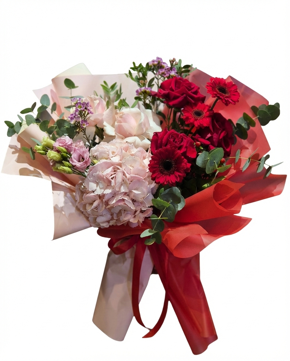Un buchet spectaculos în nuanțe de roz și roșu creat din 1 hortensia roz, 3 trandafiri roșii și 2 trandafiri roz flexați manual, 3 gerbera, 2 eustoma roz, wax flower, pistacia și eucalipt.